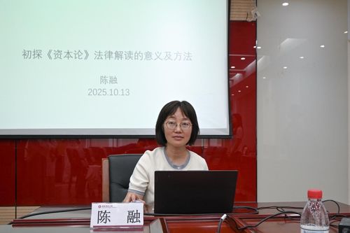 陈融老师以《初探〈资本论〉法律解读的意义及方法》为主题展开讲解,她认为《资本论》内含丰富法律元素是其“百科全书”式博大内容决定的,而马克思本人的法学背景更是增加了经典著作的法学意蕴。《资本论》内含的法律信息不仅存在于数个标题含有“法律”的章节,其各部分论述中都有涉及立法文本、法律机构、司法判决以及丰富法律实践材料。陈老师还以具体章节为例为同学们展示了对《资本论》进行法律解读的具体方法及现实价值。
