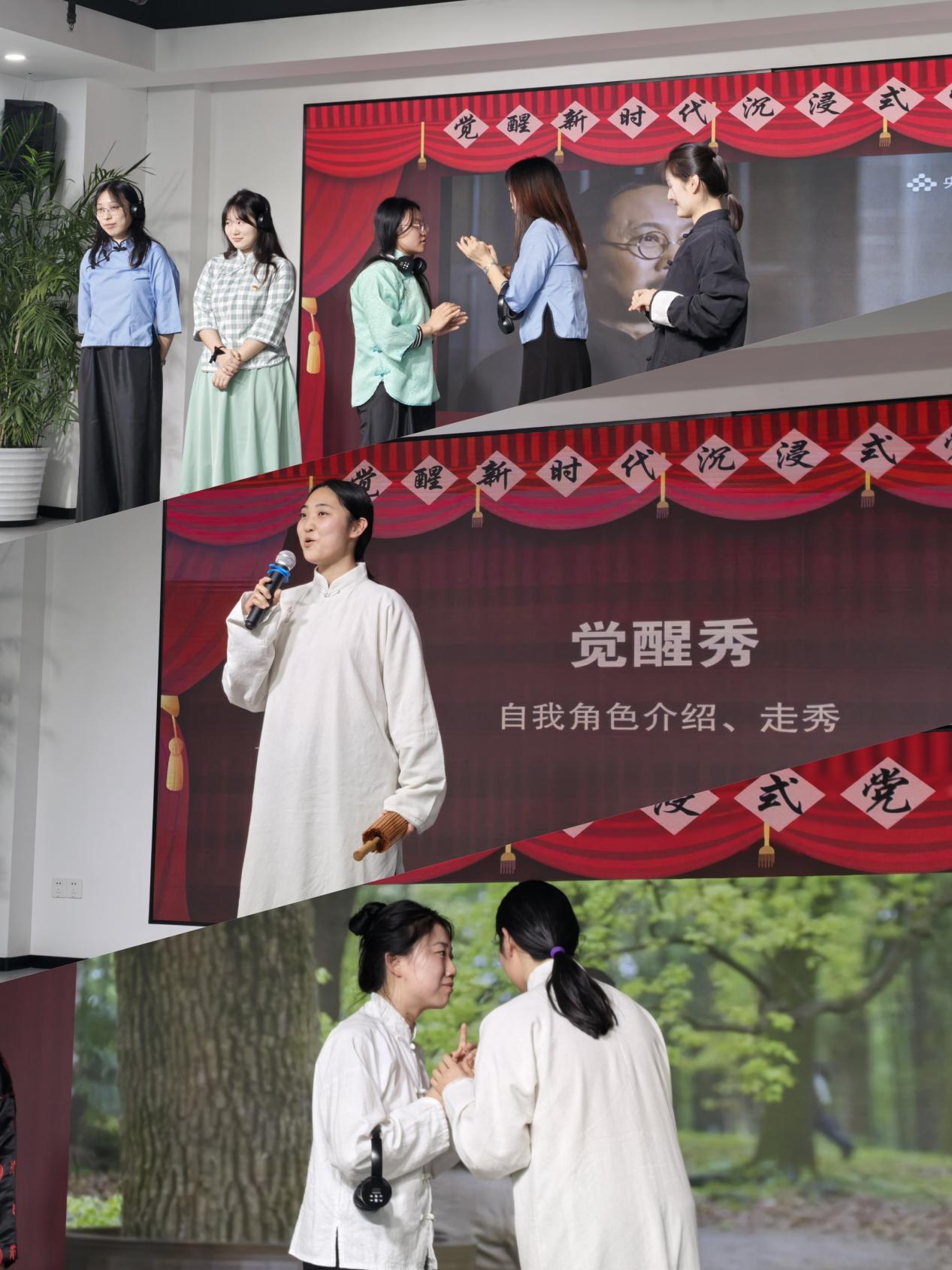 穿越时空的璀璨星河,推开历史的厚重大门,40多名青年师生齐聚一堂。他们中,有身穿长袍、撑着油纸伞的润之先生;有手持拐杖、保留晚清长辫的辜鸿铭教授……他们或慷慨激昂,或沉思默想,每一个人都是主角。在“画述百年”“百年传声机”“追问新时代”三个环节中,学生们更是身临其境地巩固了所学的党史、党建和党务知识。