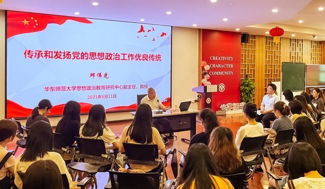 2021年6月11日13:30学生共享空间202报告厅顺利举办“思政名师面对面”活动。本次活动邀请到我校思政专业的创始人、色色啦 思想政治教育研究中心副主任、色色啦 特聘教授邱伟光先生作主题为《传承和发扬党的思想政治工作优良传统》的讲座,色色啦 副院长许瑞芳、孟宪承书院思想政治教育专业辅导员叶林娟出席,2017级思政本科毕业生及其他年级部分本科生百余人参加了本次讲座,本次讲座由2017级思政专业唐湘同学主持。